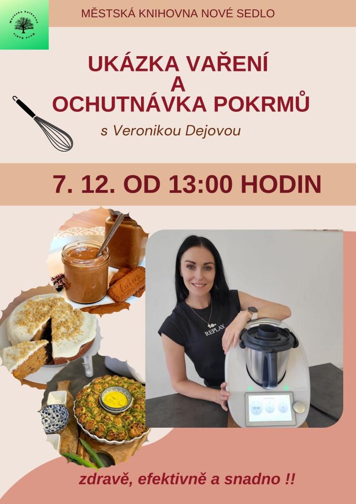Městská knihovna Nové Sedlo pořádá 7. prosince od 13:00 hodin ukázku vaření s Veronikou Dejovou. Na akci se můžete těšit na ochutnávku pokrmů a naučíte se, jak vařit zdravě, efektivně a snadno. Nezapomeňte se zúčastnit!