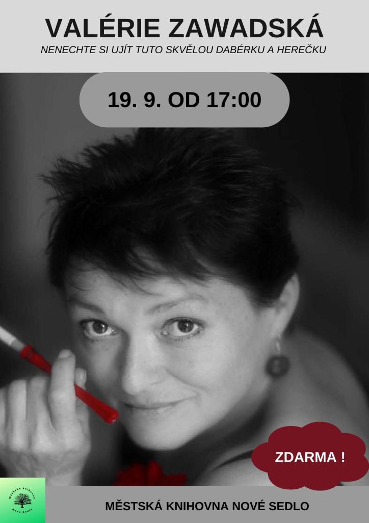 Valérie Zawadská je šestinásobnou vítězkou ankety Týtý v kategorii dabérek. Během své kariéry se objevila v několika celovečerních filmech jako Rozpuštěný a vypuštěný nebo Snowboarďáci, mnoha televizních inscenacích a seriálech (Dobrodružství kriminalistiky, Četnické humoresky, Rodinná pouta, Ordinace v růžové zahradě 2...). Nenechte si ujít dne 19. 9. od 17:00 hodin tuto talentovanou dabérku a herečku. Přednáška je pro všechny zdarma